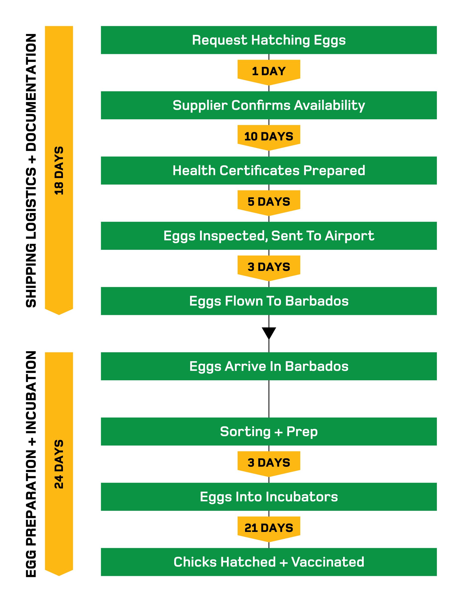 The graphics show the minimum amount of time required, however our suppliers frequently ask for more notice than 10 days. We often give estimated egg quantities until the 6 week mark arrives, at which point we have to give final purchase quantities for booking health certificates and air cargo space.